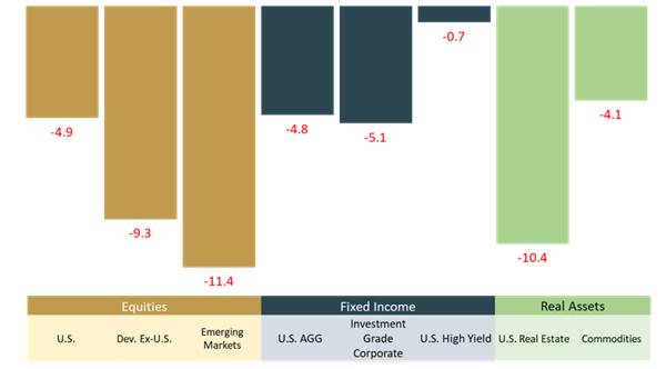 Past performance is not a reliable indicator of current or future results. Indexes are unmanaged and not subject to fees. It is not possible to invest directly in an index. Note: views are from a U.S. dollar perspective. This material represents an assessment of the market environment at a specific time and is not intended to be a forecast or guarantee of future results. Source: Kestra Investment Management with data from FactSet. Index proxies: Bloomberg U.S. Aggregate Bond Index, ICE BofA U.S. Corporate, ICE BofA U.S. High Yield, S&P 500, MSCI EM, MSCI EAFE, Dow Jones U.S. Select REIT, Bloomberg Commodity Index. Data as of September 30, 2022.