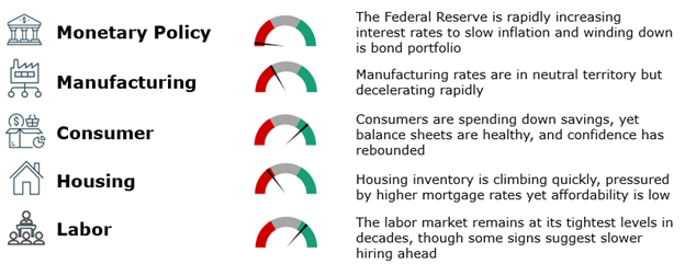 With equity and fixed-income markets already down significantly this year, much of the economic slowing appears priced in. Remember that stock and bond prices today reflect what’s expected in the future. While we expect more economic softening ahead, markets tend to rebound well before the economy does, and sometimes even before we officially know that we’re in recession.