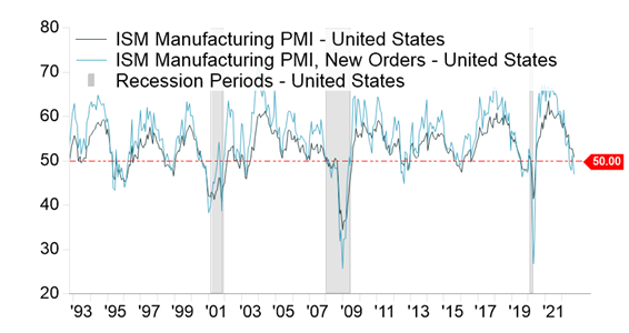If the yield curve tells us that a recession is coming, the ISM is telling us not quite yet. But if the downward momentum that we have seen over the last few months continues, it would suggest we could see an official recession by the first half of 2023.