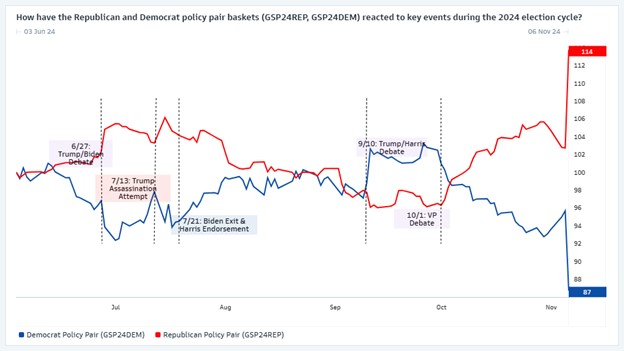 As markets prepared for election day, polling and betting markets suggested that Donald Trump had a slight edge, which triggered a shift in markets. In equities, this led investors to start allocating into companies expected to benefit under a Donald Trump presidency, including financials, energy, and onshoring enablers. The market performance of these companies compared to those expected to benefit under a Kamala Harris presidency fluctuated in response to key events throughout the campaign season. Beginning in early October, markets appeared to firmly price in a Trump victory, a sentiment that persisted through election day.